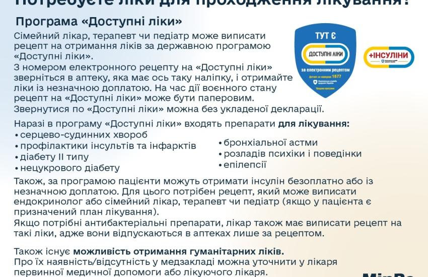 Інформація для внутрішньо переміщених  осіб стосовно отримання  медичної допомги та безоплатних ліків за державною програмою „Доступні ліки“.