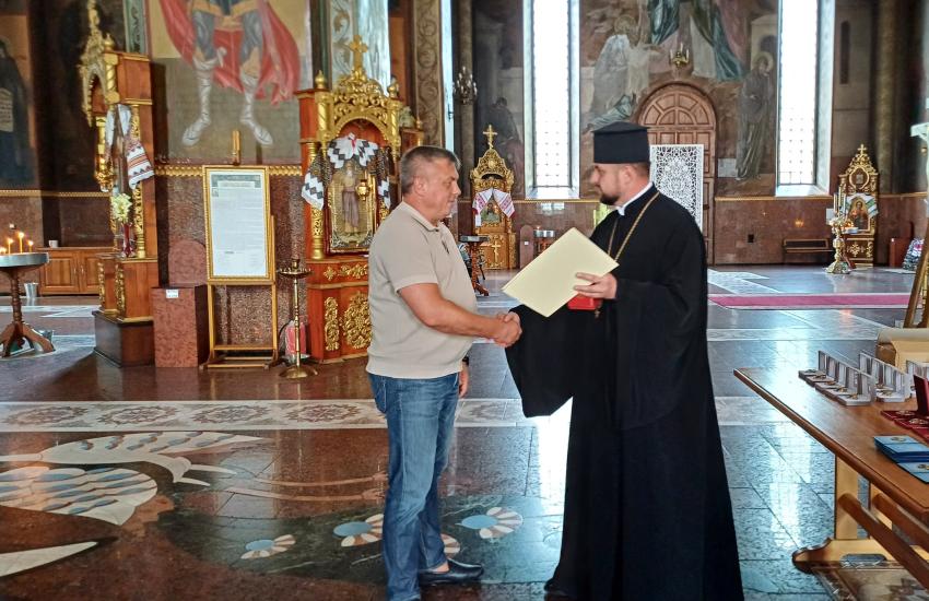 Вручив відзнаки за заслуги перед Помісною Українською Православною Церквою, побожним народом та за жертовне служіння у збереженні дару життя Благочинний Свято-Михайлівського кафедрального гарнізонного собору, головний капелан 118-ї окремої бригади територіальної оборони Черкаської області отець Володимир Гладковський.